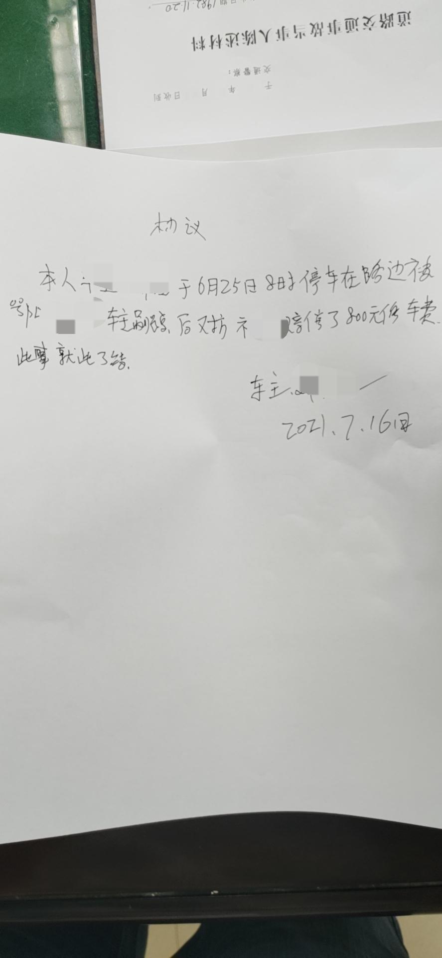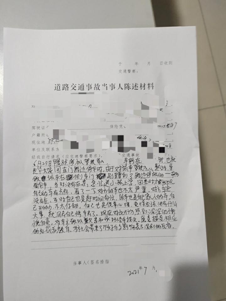 结果后来对方车主报警了调取附近监控查到我车牌号,大约半个月后交警就电话通知我了。我过去后里面道歉解决,对方修车才600,我立马给了888.88,处理的很和谐,对方大哥也是蛮好,很理解知道都是不小心也不是故意的,为我写了谅解书,还说算是交个朋友。