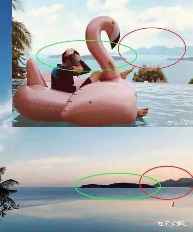 但是俩人照片中的泳池不太一样,一个边缘向外凸,另一个是水平的。