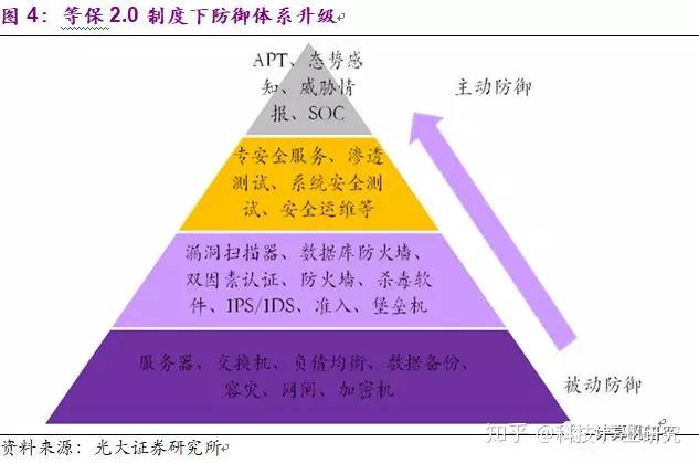 (2)等级保护首次加入了“未知攻击”的检测、SOC等主动防御的要求,以前信息安全以防火墙、杀病毒、IDS等被动防御为主,随着安全威胁的升级,等保制度也积极响应,提出主动防御上的要求,这将有望带动威胁情报、态势感知、APT攻击检测与防护和SOC等主动防御产品的需求增加。