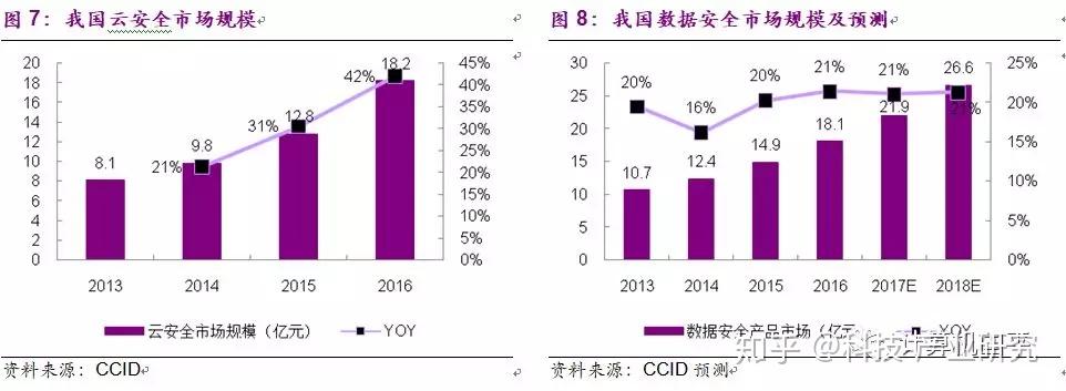 :根据CCDI的报告,2014-2016年我国云安全市场规模分别为9.8亿元、12.8亿元和18.2亿元,同比增速分别为21.3%、30.6%和42.2%,行业呈现爆发式增长趋势。阿里云、华为、腾讯云、360企业安全等厂商竞争力靠前。