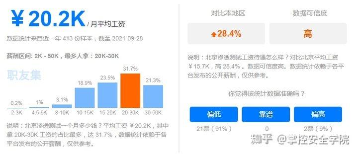 这是北京地区的渗透测试工程师的平均工资,其中10-30K的人占了74.1%,而30K以上的人也有21.3%。薪资相比同地区高出28.4%,说明岗位需求非常大!