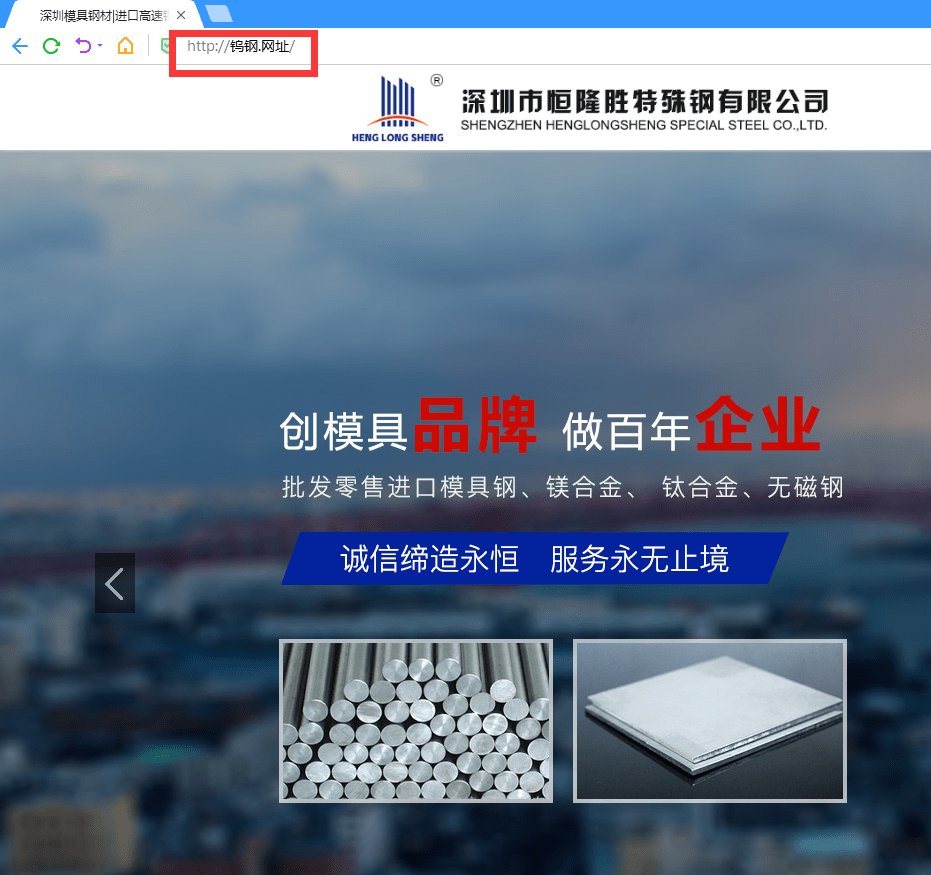 深圳市恒隆胜特殊钢有限公司启用中文域名“钨钢.网址”,搜索中文域名“钨钢.网址”即可直达企业官网,这对于国人来说,便利性得到了极大的提高,记忆简单、输入简便的特效,是传统英文域名所不具备的。