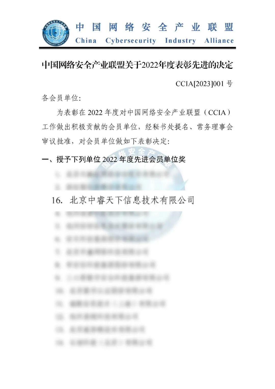近日,中国网络安全产业联盟(CCIA)发布“关于2022年度表彰先进的决定”,对在联盟工作中做出积极贡献的会员单位进行表彰,中睿天下荣获中国网络安全产业联盟“2022年度先进会员单位“奖。