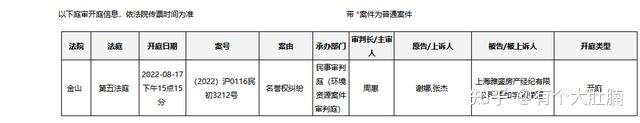 7月28日,封面新闻记者在上海市高级人民法院网站查询发现,张杰、谢娜与上海雅銮房产经纪有限公司、霍如学、项荣富名誉权纠纷案将于2022年8月17日15点15分在上海市金山区人民法院第五法庭开庭,案号为(2022)沪0116民初3212号。